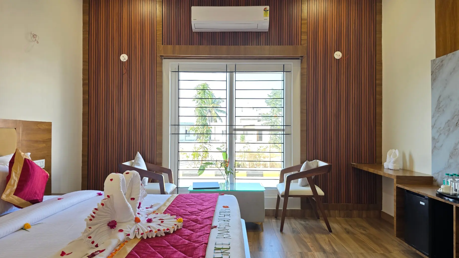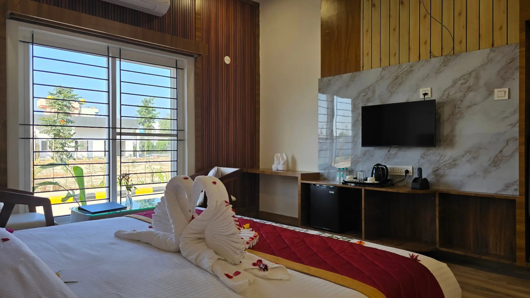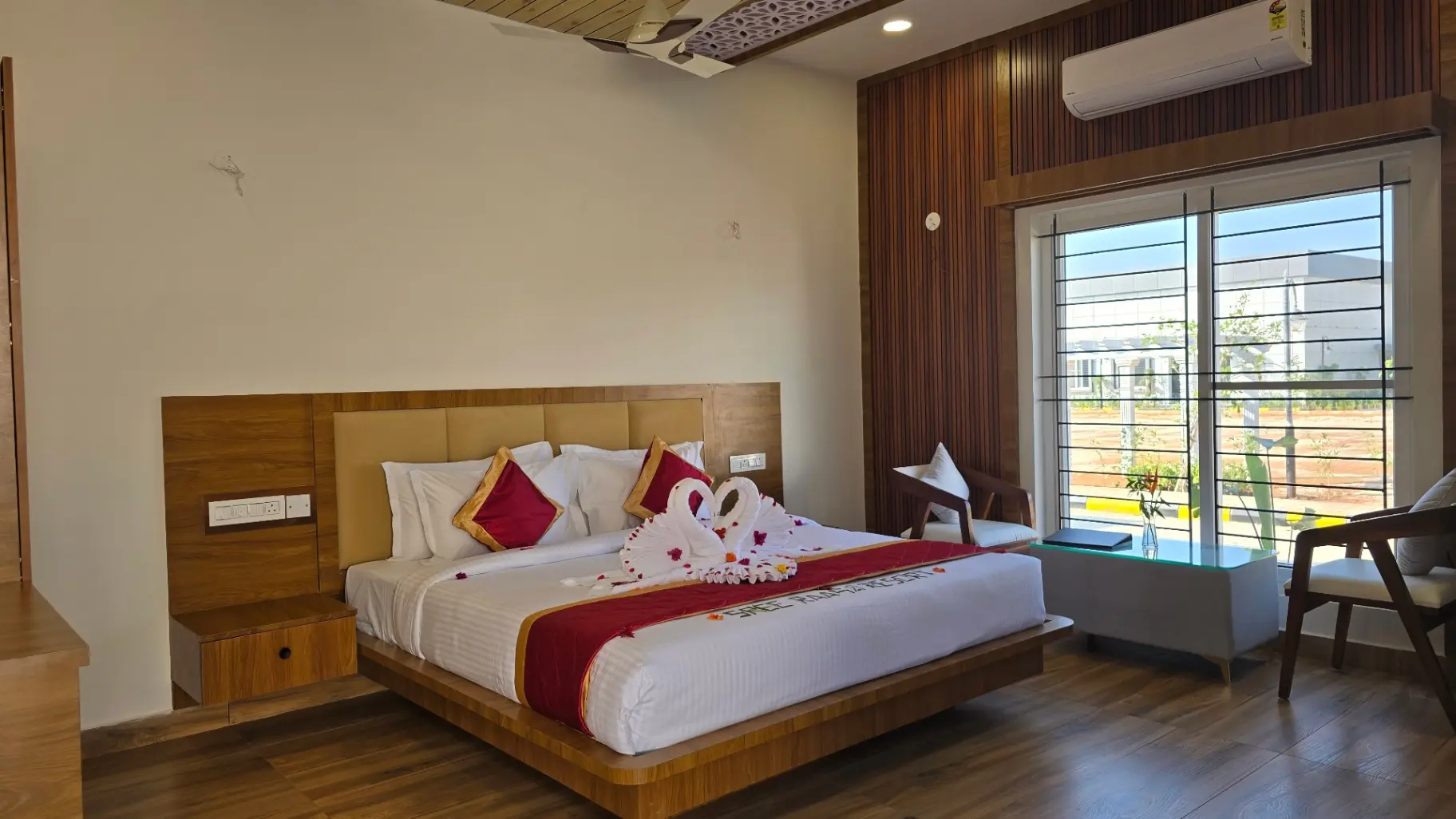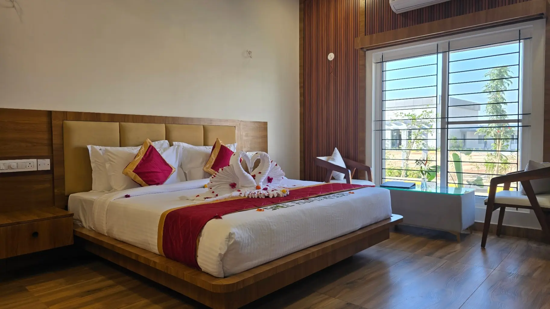 The Compact Villa at Sree Raaga Resorts is thoughtfully designed for solo travelers and couples seeking comfort within a well-appointed space. Featuring a cozy sleeping area, a modern en-suite bathroom, air conditioning, and complimentary Wi-Fi, the villa offers all essential amenities for a relaxing stay.